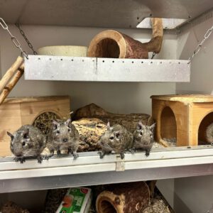 Die fünfer Truppe ist super quirlig, extrem lebhaft, lustig und auch zutraulich. Degus benötigen einen nagesicheren und großen Käfig, da sie einfach alles zernagen und sehr aktiv sind. Hohes Einstreu, Heu und Stroh zum buddeln und Höhlen bauen, ein Sandbad und Nagematerial aus Holz, Kork oder ähnlichem sind sehr wichtig für sie.