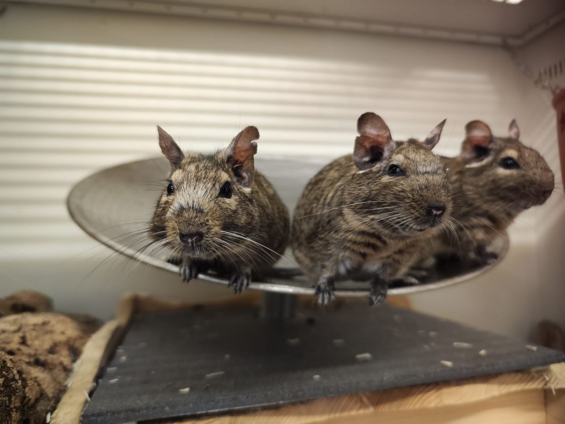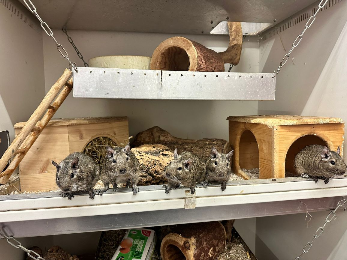 Die fünfer Truppe ist super quirlig, extrem lebhaft, lustig und auch zutraulich. Degus benötigen einen nagesicheren und großen Käfig, da sie einfach alles zernagen und sehr aktiv sind. Hohes Einstreu, Heu und Stroh zum buddeln und Höhlen bauen, ein Sandbad und Nagematerial aus Holz, Kork oder ähnlichem sind sehr wichtig für sie.